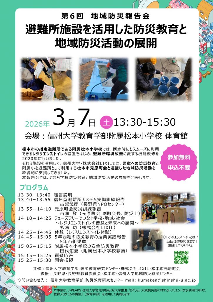 2026年2月19日 / 最終更新日時 : 2026年2月19日 admin お知らせ 【3月7日開催】第 6 回 地域防災報告会のお知らせ 3月7日に避難所施設を活用した防災教育と地域防災活動の展開が開催されます。詳しくは以下のチラシをご覧ください